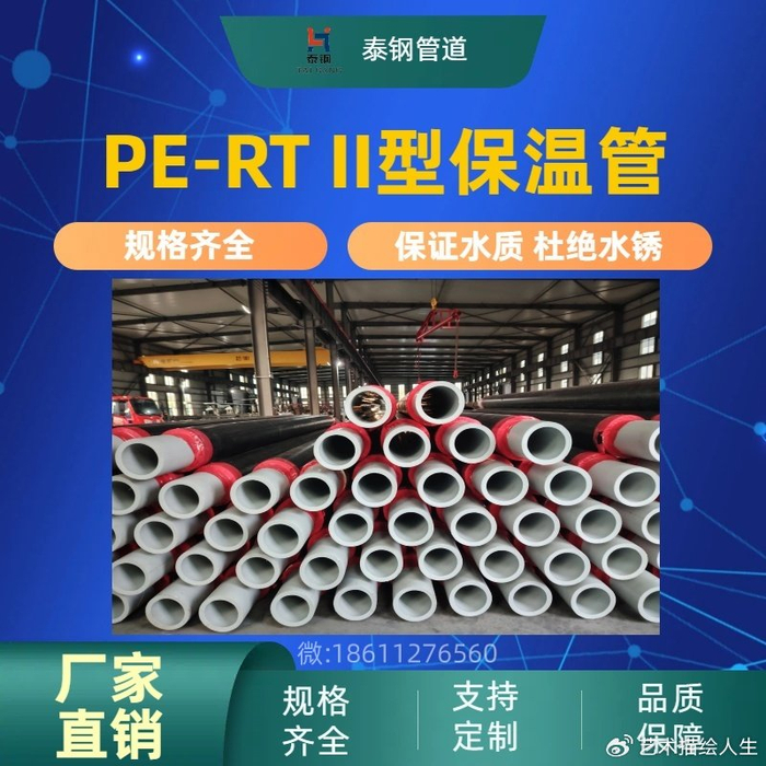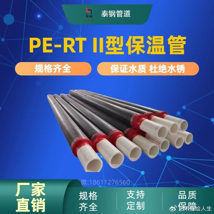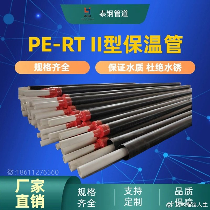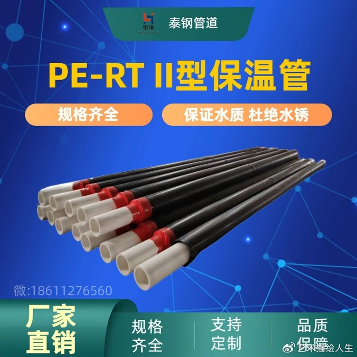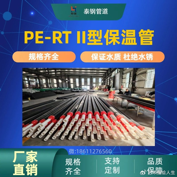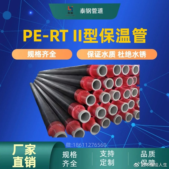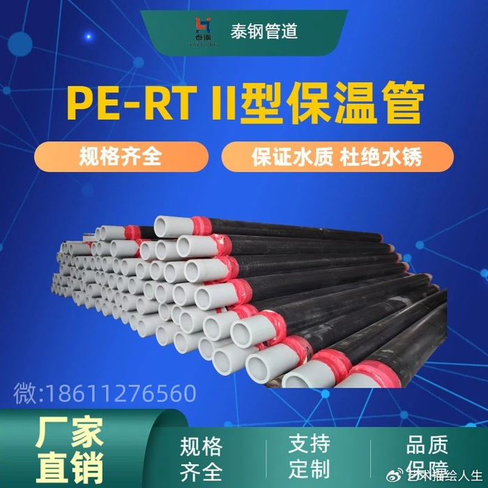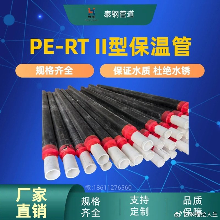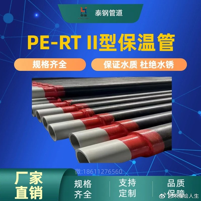 PERT二型保温管道是新型耐高温管材,既保留了聚乙烯的耐低温特性,又提升了其在高温条件下的抗蠕变性能和强度,具有较好的柔韧性和热传导性,易加工、可回收、可焊接,适用于民用建筑冷热水管路系统、工业热介质输送系统、地板辐射采暖系统等。pert二型型由于塑料材料是热的不良导体,pert2型耐热塑料管的热导率不足钢管的1% ,即管道本身就具有一定的保温性能, 且 PE-RT二型耐热塑料管、保温层、外护管的热膨胀系数基本相同,三层之间会成为一个整体,不易产生脱层 问题,管道保温效果将优于钢管,在相同保温效果下将节省保温材料的使用,因此PERT I1型耐热塑料保温管的保温性能优于传统保温管。